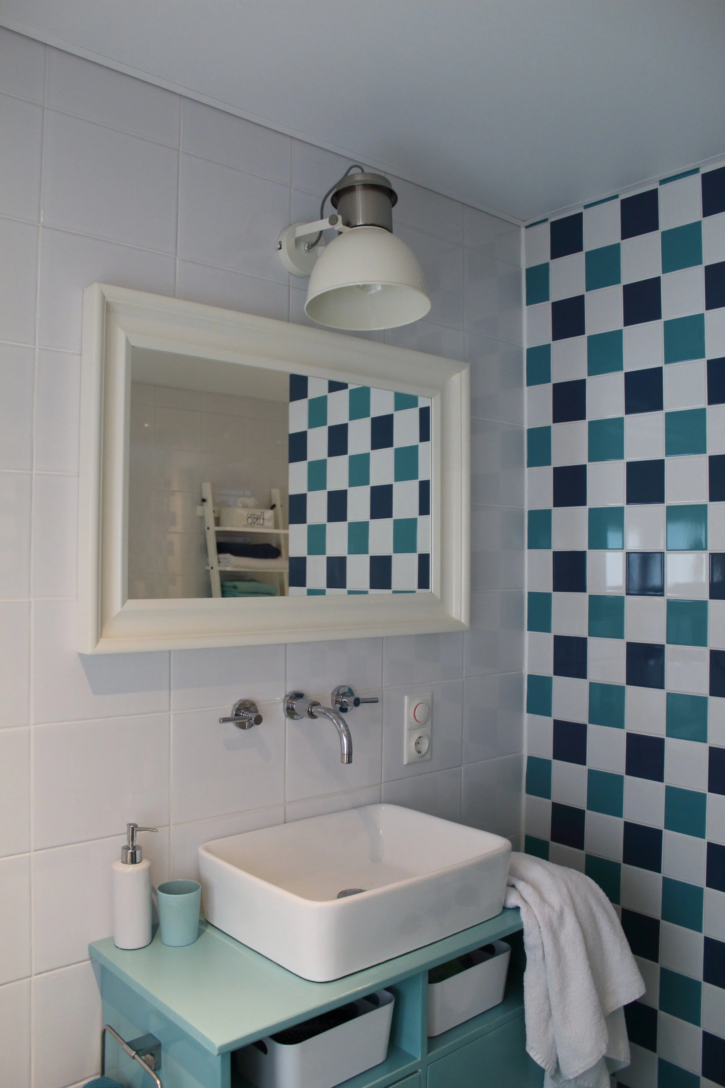 Hier is gekozen voor tegels in verschillende tinten groen op één tussenmuur in combinatie met witte tegels. Een bijpassend gekleurd meubel en wit sanitair zorgen voor een sfeervol geheel!